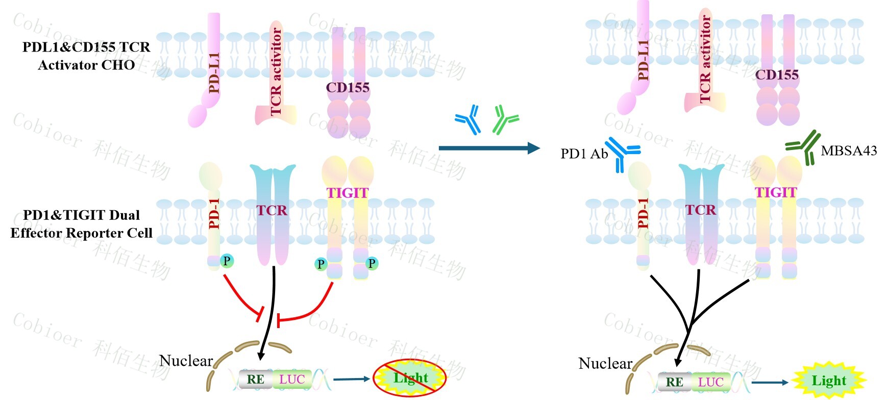 PDL1&CD155 TCR Activator CHO 作為 PD1&TIGIT Dual Effector Reporter Cell 的靶細(xì) 胞,很好的模擬了體內(nèi) PD1&TIGIT 的信號(hào)轉(zhuǎn)導(dǎo)過程,原理見下圖所示。