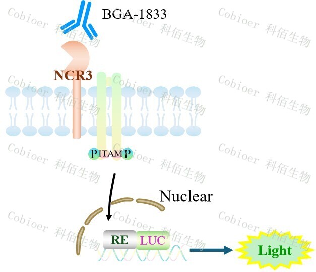 NCR3(NKp30) Effector Reporter 報(bào)告基因藥靶模型很好的模擬了體內(nèi) NKp30 的信號 轉(zhuǎn)導(dǎo)過程,原理見下圖所示。![]() Figure 1. NCR3(NKp30) Effector Reporter 細(xì)胞模型原理圖 |