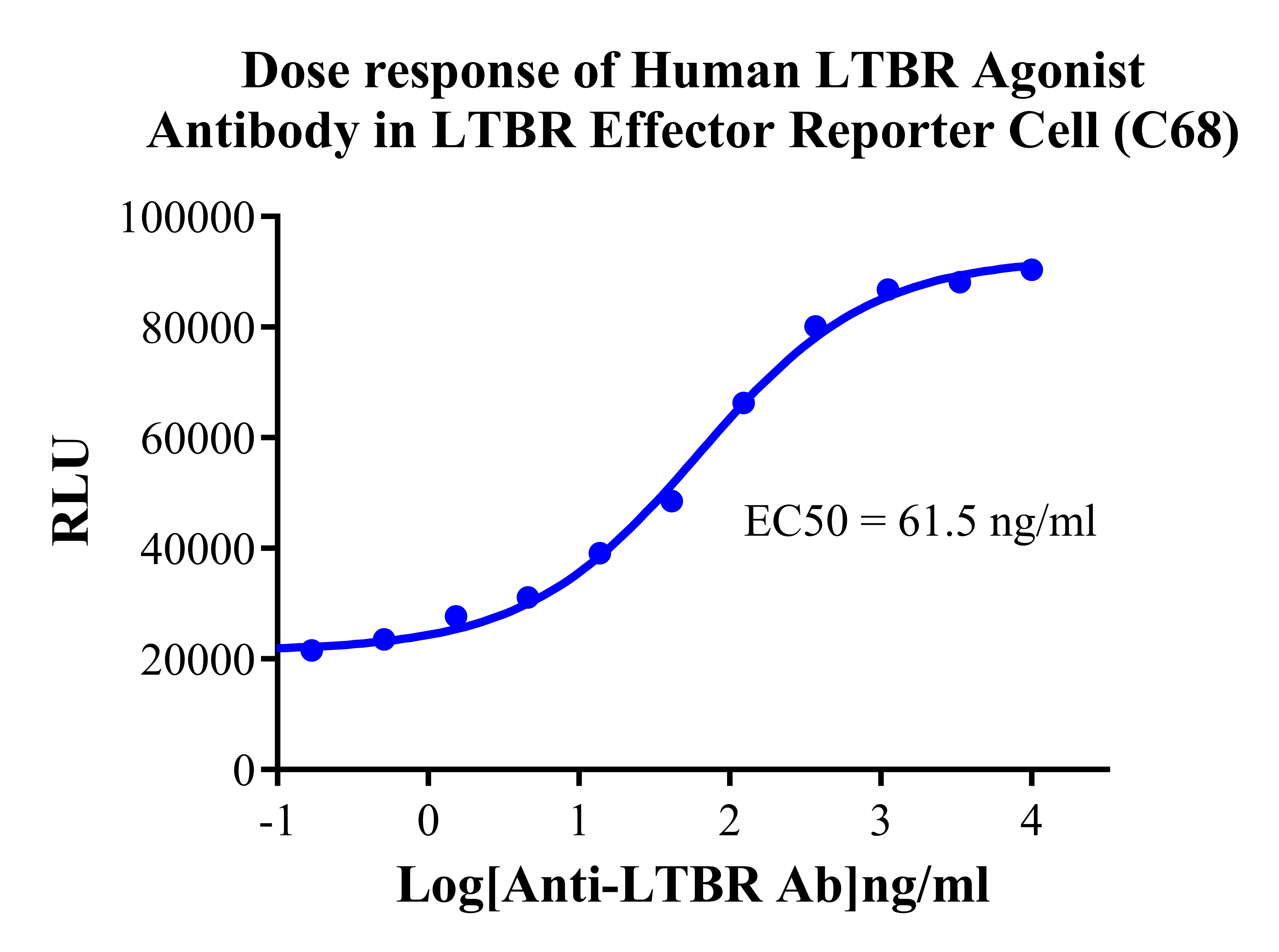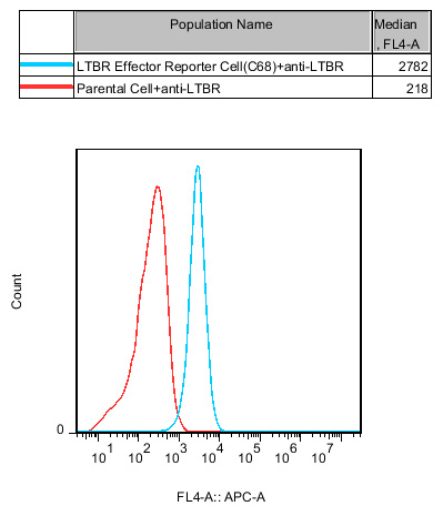 III. Representative Data![]() Figure 2. Recombinant LTBR Effector Reporter Cell stably expressing LTBR. ![]() Figure 3. Dose Response of Human LTBR Agonist Antibody in LTBR Effector Reporter Cell (C68). |