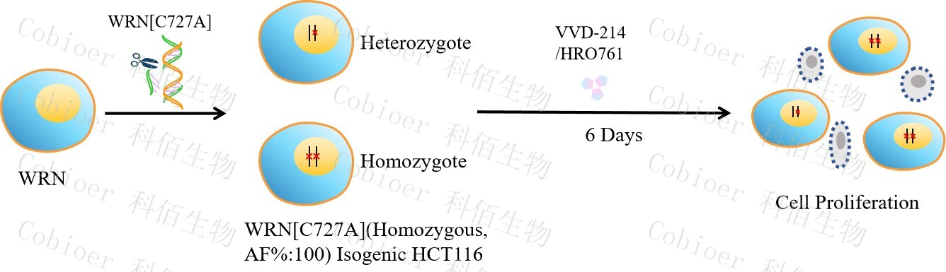 WRN[C727A](Homozygous,AF%:100) Isogenic HCT116 藥靶細(xì)胞,通過(guò) 基因編輯的方式將 WRN 的 727 位氨基酸胱氨酸(C)突變?yōu)楸彼幔ˋ)。![]() Figure 1. WRN[C727A](Homozygous,AF%:100) Isogenic HCT116 原理示意圖 |
