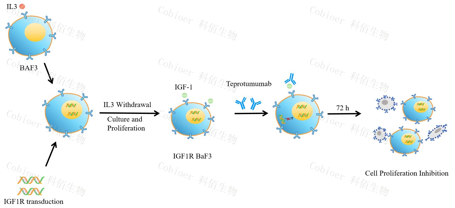 BaF3(小鼠原 B 細(xì)胞)的生長和增殖需要 IL-3 的維持。通過引入各種表達(dá)激酶的基因, 能作為 BaF3 的驅(qū)動基因,讓 BaF3 不再依賴 IL-3 而增殖,進(jìn)而激酶基因成為 BaF3 增殖依 賴的驅(qū)動基因,用于評估小分子藥物對激酶的靶向抑制作用,原理及流程見下圖所示。![]() Figure 1. IGF1R BaF3 細(xì)胞模型原理圖 |