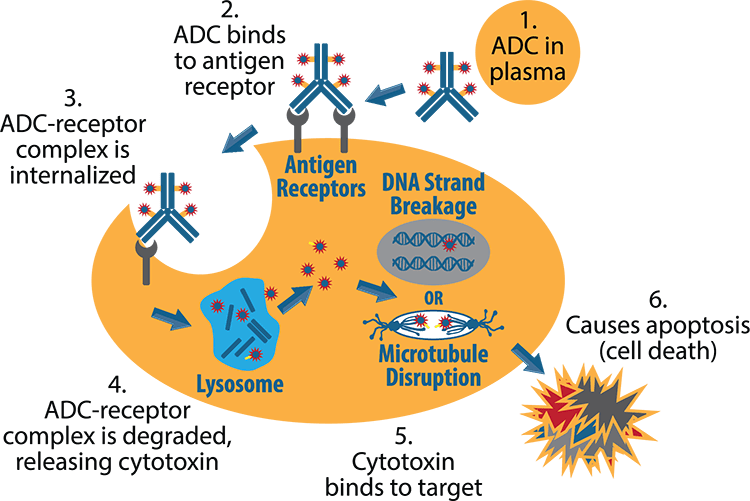 ADC藥物通過靜脈注射到血液中,隨著血液的流動(dòng),到達(dá)全身,但是科學(xué)家估計(jì)只有0.1%的ADC能到達(dá)患者的癌細(xì)胞。大部分會(huì)在循環(huán)系統(tǒng)和其他器官及組織中逐漸分解。到達(dá)癌細(xì)胞的ADC藥物一般是經(jīng)歷6個(gè)過程來起作用。