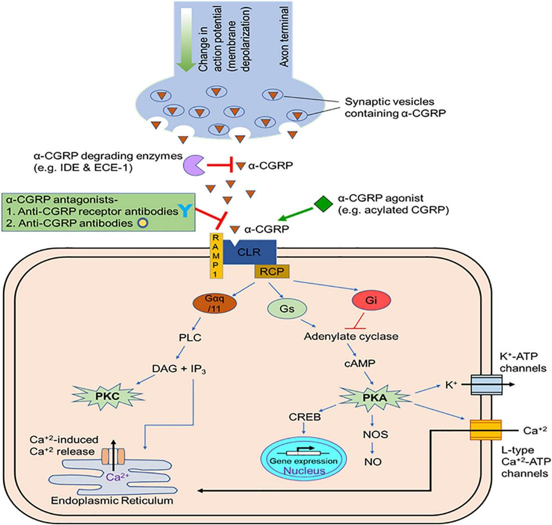 降鈣素基因相關肽(calcitonin gene-related peptid,CGRP)是一個含有37個氨基酸殘基的感覺神經(jīng)源性多肽,分為α-CGRP和β-CGRP兩個亞型,廣泛分布于中樞神經(jīng)系統(tǒng)(主要是三叉神經(jīng)血管系統(tǒng)、丘腦和小腦)。CGRP是一種強效的血管擴張劑,它主要由感覺神經(jīng)(如三叉神經(jīng))釋放。CGRP釋放后與腦血管平滑肌細胞表面的CGRP受體結(jié)合,引起腦血管擴張。CGRP受體的結(jié)構(gòu)主要包括:降鈣素受體樣受體(CALCRL)、活性修飾蛋白受體(RAMP)及結(jié)構(gòu)蛋白受體(RCP)。CGRP受體復合物是一種G蛋白偶聯(lián)受體,通過激活蛋白激酶A系統(tǒng),參與疼痛信息的病理調(diào)控過程。