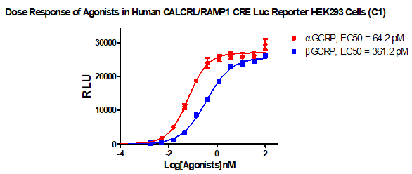 針對CGRP靶點藥物開發(fā)研究的需求,科佰生物開發(fā)了CALCRL/RAMP1/CRE-Luc/HEK293藥篩細胞模型,歡迎來電咨詢。部分數(shù)據(jù)展示如下: