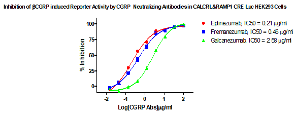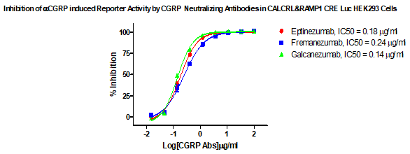 Figure 4. Inhibtion of αCGRP induced Reporter Activity by CGRP Neutralizing Antibodies in CALCRL&RAMP1 CRE Luc HEK293 Cells.