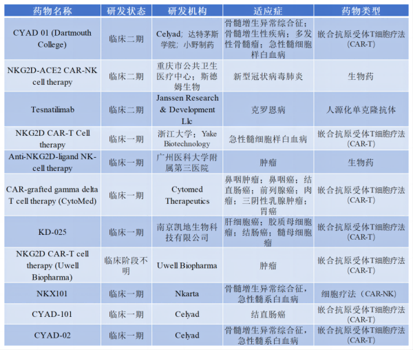 截至目前,全球有11種針對NKG2D的在研藥物,主要集中在臨床早期,其中以CAR-T細(xì)胞療法為作用機(jī)制的就有10種。而CAR-NK療法因?yàn)闆]有發(fā)現(xiàn)細(xì)胞因子釋放綜合癥及神經(jīng)毒性等副作用,因而比CAR-T療法具有優(yōu)勢,這可能是由于NK細(xì)胞本身不容易導(dǎo)致過高的細(xì)胞因子分泌。除此之外CAR-NK療法不需要以患者的自體免疫細(xì)胞作為來源、治療成本更低等優(yōu)勢可能使它成為CAR-T療法的一大競爭對手。除抗腫瘤藥物外,強(qiáng)生旗下的楊森公司針對該靶點(diǎn)在自身免疫疾病方面的作用開發(fā)了一款單抗類藥物,通過抑制該靶點(diǎn)活性來降低克羅恩病患者的炎癥反應(yīng)。